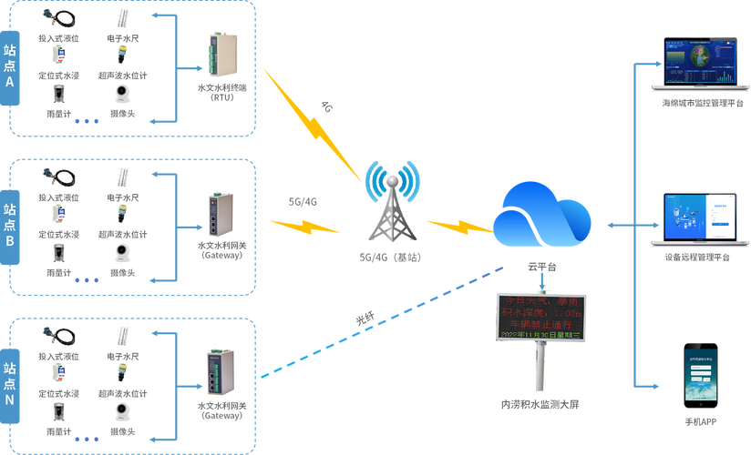 场景描述:水文站、水库、河道、灌区、沿海潮位监测点,监测水位、流量、降雨量、潮位等。